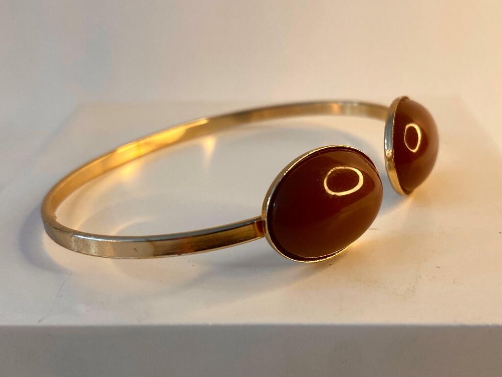 Este bracelete é a combinação perfeita de simplicidade e sofisticação. Com acabamento dourado e duas pedras marrons de formato oval, ele oferece um toque de elegância e modernidade. Ideal para compor looks versáteis, é leve e confortável para o uso diário. Uma peça que se destaca pela sua delicadeza e estilo atemporal, perfeita para quem busca sofisticação em detalhes minimalistas.