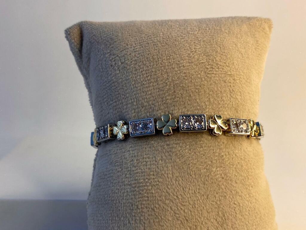 Pulseira delicada em ouro e ródio, composta por detalhes em formato de trevo que simbolizam sorte e elegância. Os trevos alternam com pedras de zircônia que proporcionam um brilho sofisticado, destacando o design único da peça. Ideal para quem busca um acessório com charme e significado, perfeito para ocasiões especiais ou para dar um toque refinado ao dia a dia.