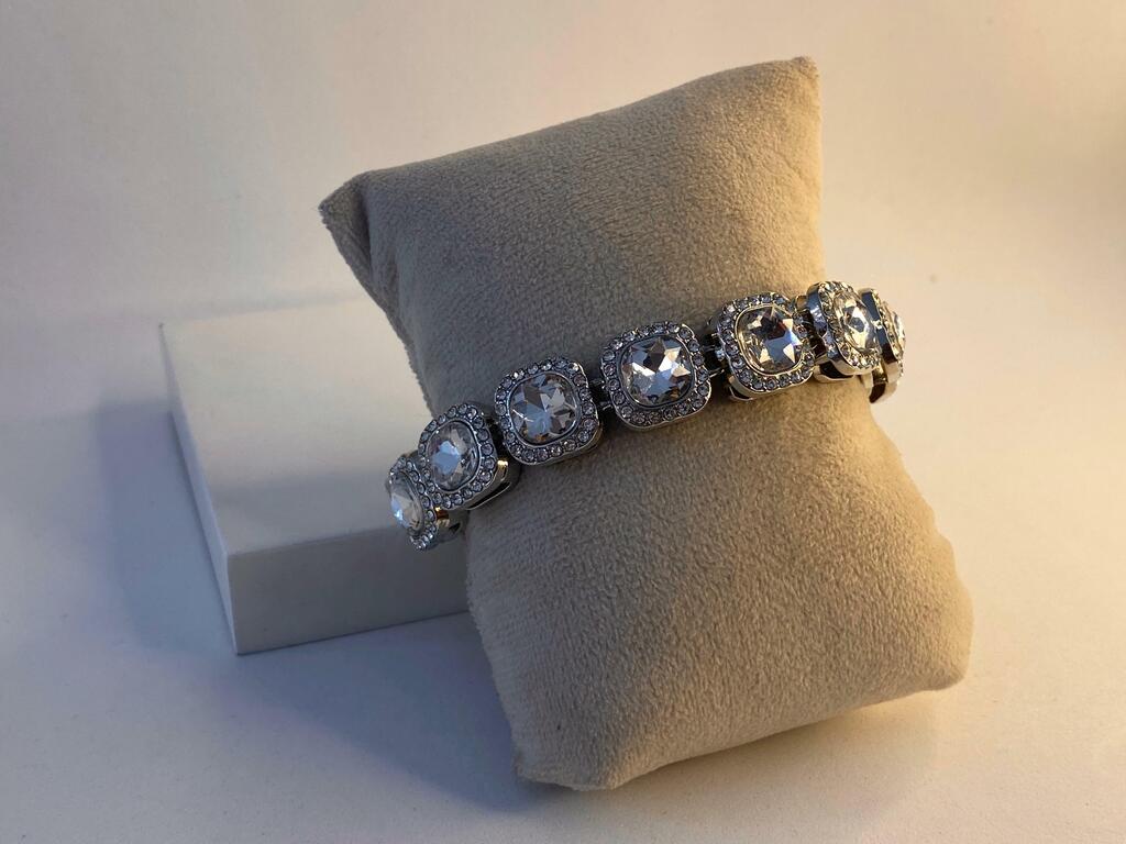 Essa pulseira apresenta um design requintado, composto por cristais lapidados em molduras delicadamente decoradas, conferindo sofisticação e brilho. Perfeita para ocasiões especiais e para elevar qualquer look com elegância.