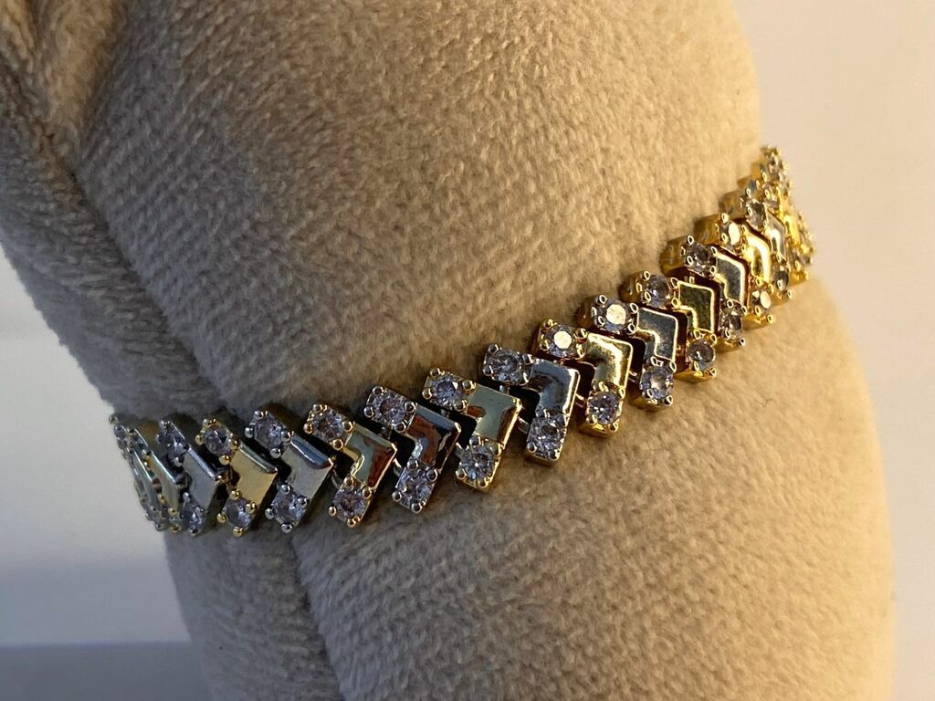 Pulseira elegante com banho de ouro e ródio, apresentando um design exclusivo em formato de flechas, adornado com cristais brilhantes cravejados. Um acessório sofisticado que combina delicadeza e modernidade, perfeito para compor looks únicos e cheios de estilo.