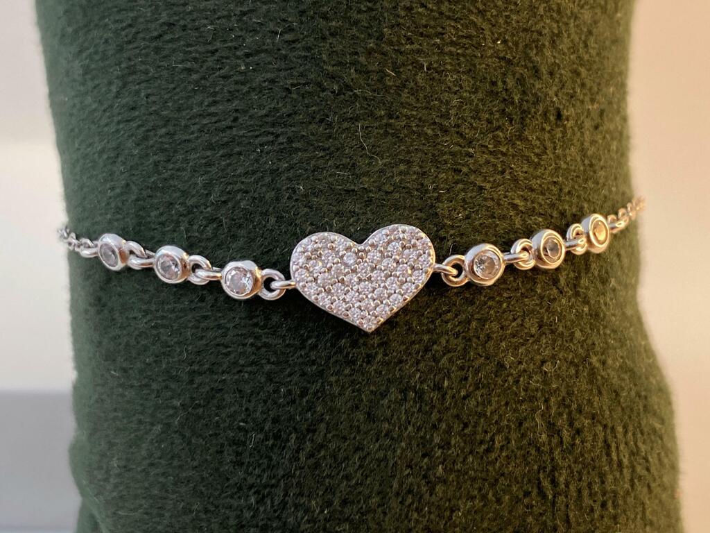 Pulseira delicada com banho prateado e um elegante pingente em formato de coração, cravejado com pequenos cristais brilhantes. A corrente é adornada com detalhes em pedras redondas, conferindo sofisticação e charme ao acessório. Ideal para momentos especiais ou para compor um look delicado e feminino.